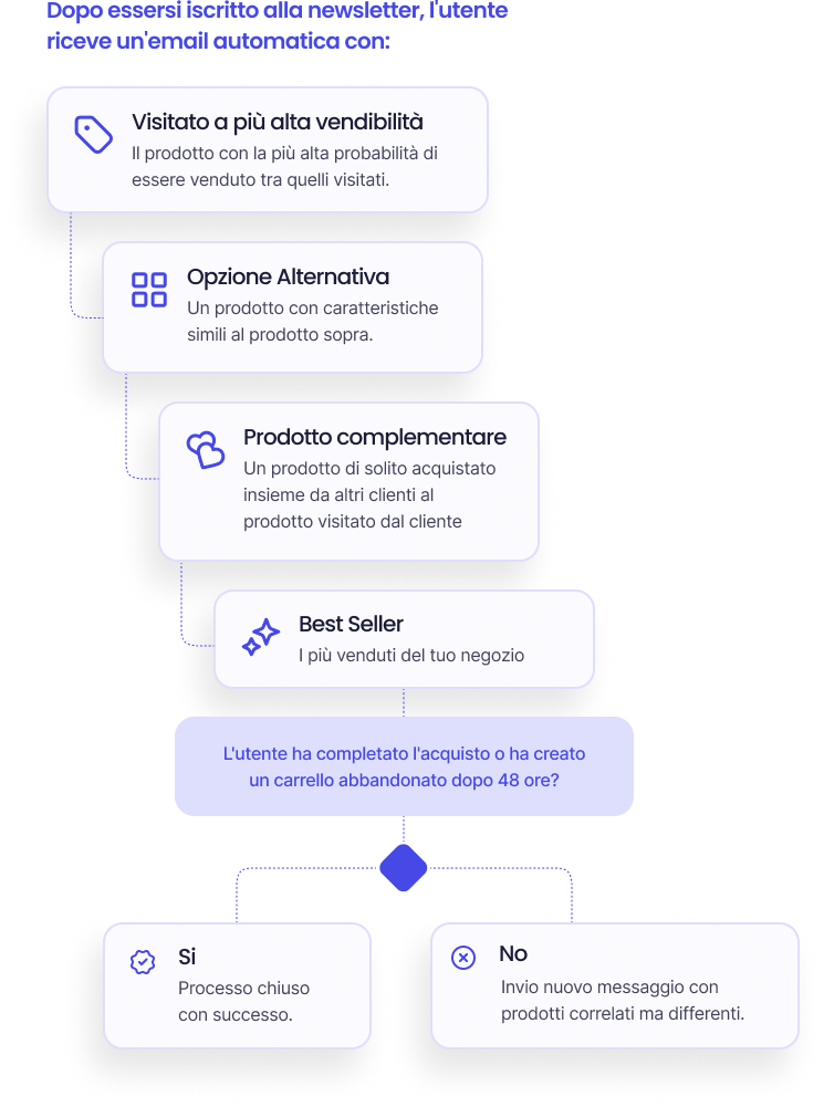 Personalizza le tue campagne senza sforzo con raccomandazioni prodotto dinamiche. Imposta le regole, applica